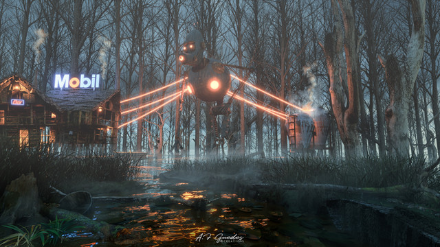 I wanted to try something that is somewhat inspired by the lovely works of Simon Stålenhag, and this is what I came up with! Made with Blender, Substance Painter, and Photoshop. This took about a week of off-and-on work. The scene was originally set as a lakeside view but I felt that detracted from the subject too much. Thanks for looking