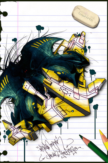 -The 3D graffiti was hand drawn then scanned into my computer.