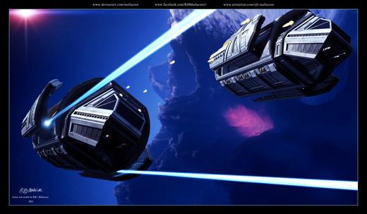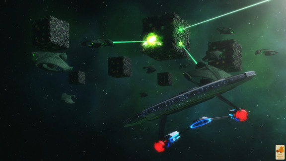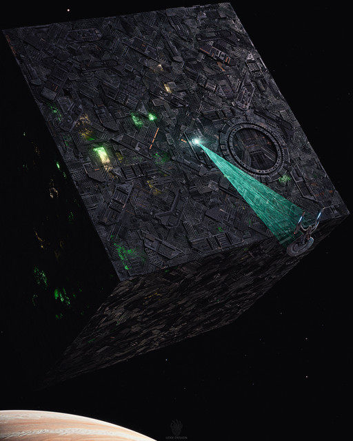 Cube looks good, but what is that it's tractoring? Probably just my poor eyes (it's hard for me to see details in dark colors anymore), but it looks more like the Winnebago from Spaceballs than anything I recall seeing on Star Trek.Β Β