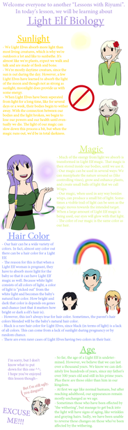 Got the idea from becauseshe'sthequeenofspeciesmaking with her comics/ info sheets on her MPs. It's just that I've got so much in my head about Light Elves and their lives I wanted to expand upon it and tell others, making their race more... well, defined. I think that's the word I'm using. However, I wanted to make mine more interactive, so I'm decided Riyumi, as the only Light Elf outside the kingdom, to teach others about her people, their culture, and other such things. Andyes,herparentsarenotgoingtobehappywithhertellingyouallaboutherkindhuuhuu