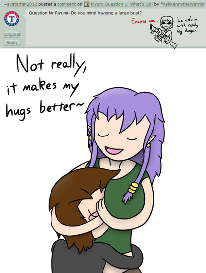 Riyumi: *eyes shining in tears, she embraces Kenny tightly, her head nuzzling his cheek* I love you Kenny!