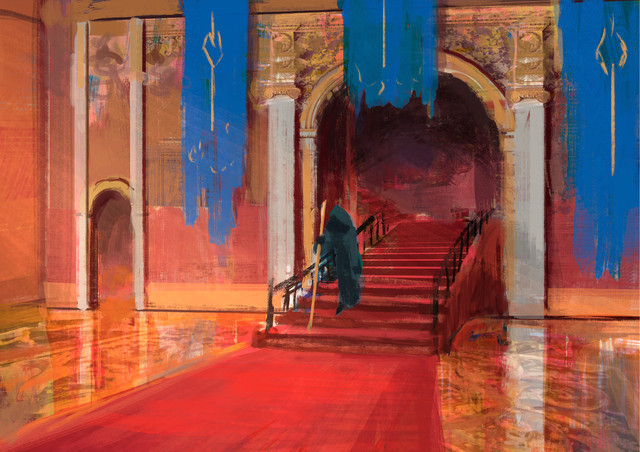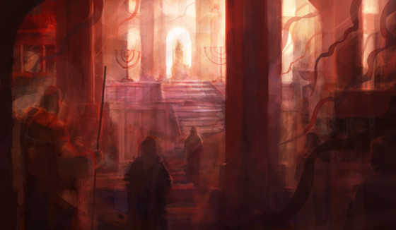 I love the way you've done the light and the pillars. One thing, though- the figure's head threw me off for a few seconds. It's just at an odd angle. Other than that, though, very nice.