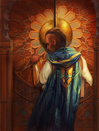 Very cool. I love the blue of the man's outfit -- it contrasts well with all the warmth of the background, but is in no way jarring. Somehow it fits harmoniously in with the rest of the composition! Such a lovely drawing -- and I quite like the sketchiness!