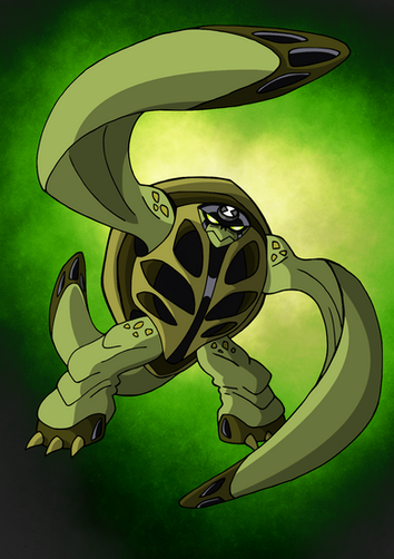 The last of the unmentioned three, Shellhead. Now I know Kenny says that "Shellhead is just a big turtle who's only power is to hide in his shell." But this is my design and my account so I'll do whatever I want with him. So getting right down to it, like with Snakepit, I wanted Shellhead to have a more alien look, rather than just a regular turtle, and I think he turned out really well. I loved putting the Omnitrix on top of the shell, so anyway, let's get to the powers.Powers: Shellhead is a 1 foot tall turtle (making him one of the small aliens). But since he's small he can creep into small places and sneak quietly. His shell is completely indestructible, this includes the Omnitrix as I assume it's pretty much durable anyway, nothing can penetrate it and he can hide in it, making Shellhead one of the most indestructible aliens Ben has. He can also teleport at a fast pace withing a range of 2 miles or so, as well as teleport anyone who's touching him.