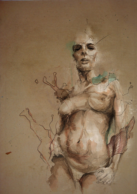 the figure was the first thing I painted. But I did put a red down with watercolor behind the while thing before I did the figure