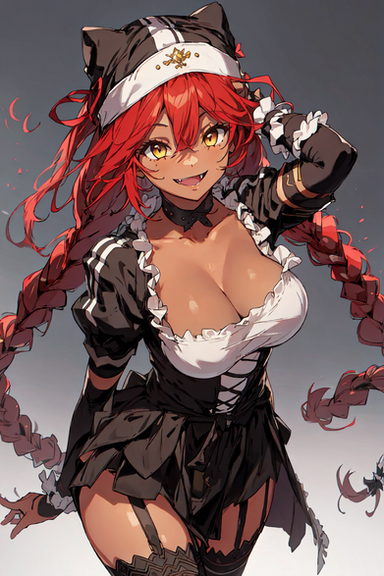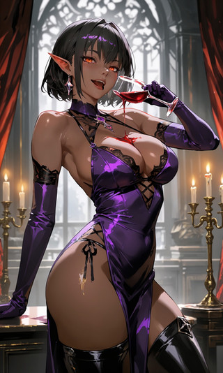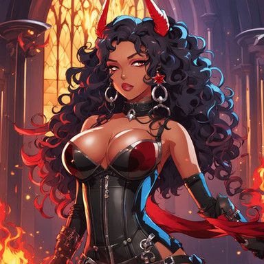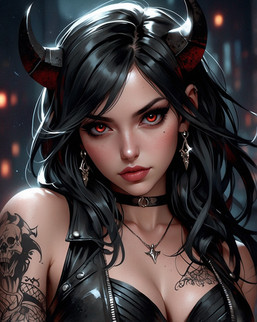 This devil girl's gaze is enigmatic, with piercing eyes that convey a hint of mischief and a magnetic charm. Her lips, painted in deep, seductive shades, curl into a knowing smile, suggesting a confident and alluring presence.