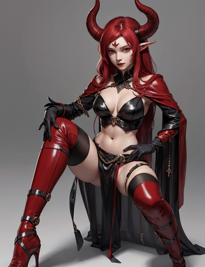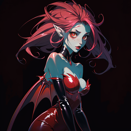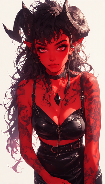 Clad in sleek and form-fitting latex clothing, she exudes a captivating blend of sensuality and power. The glossy fabric accentuates her curves, from the curve of her hips to her hourglass figure. Her attire incorporates intricate details like ornate patterns, revealing her devilish lineage and adding to her allure.