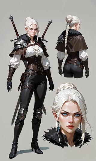 With flowing silver-white hair cascading over her shoulders, Gwyneth carries an air of mystique. Her piercing golden eyes, reflecting wisdom and experience, survey the world with a keen discernment. Adorned in leather armor, meticulously crafted for agility in combat, she wields twin swords strapped to her back with practiced ease.