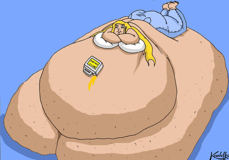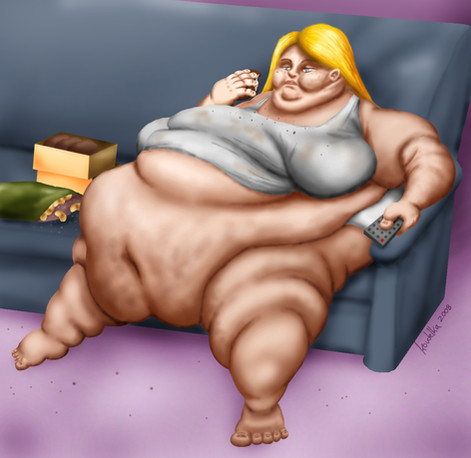 I love how the small picture of her first paying the computer contrasts with her now obese state. Nice job on her rolls, too.