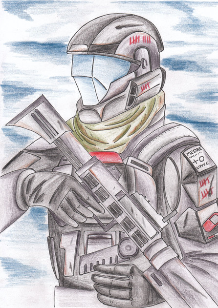 Very well drawn and colored. Love how you managed to convey sadness on his helmeted face. Very well done.