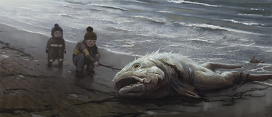 Lovely work, I like the sense of story here. I imagine she is a castaway from some shipwreck, and the mutant fisherman guy either found her. Somehow I imagine the guy is asking if she wants some fish. XD You did a nice job with the elements, too. I can almost feel the cold sea spray and early morning breeze!
