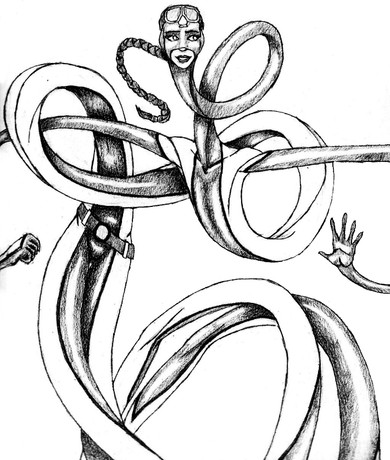 Glad you like the approach I'm taking to her stretching, I definitely want to emphasize in my drawings that RB is flesh and blood, muscle and sinew, skin and bones rather than a blob or solid hunk of rubber in the shape of a woman. It can be tricky, sometimes, because a lot of the time the muscles and body shapes get pulled so far out of shape that you kind of can't avoid them just turning to noodles!