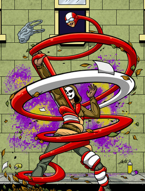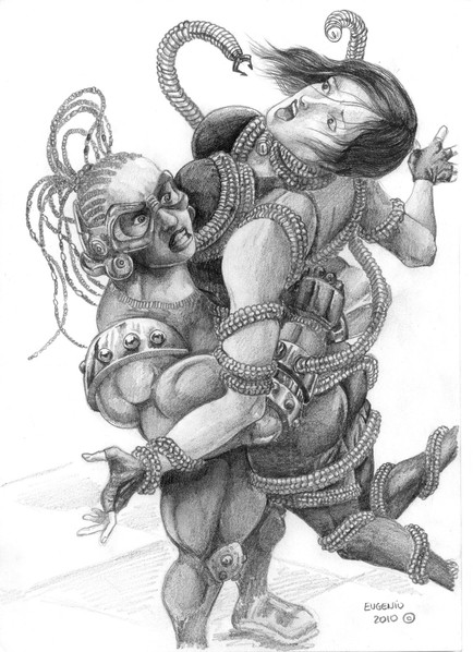 Rubber Bullette went with several of her fellow heroines to investigate an illegally improvised prosthetics lab wherein a super villain was kidnapping people and turning them into cyborgs. At the location, a Hazard Robot ambushed the four heroines and proved too much for each of them individually. Once the four of them had been rebuffed in their attempts to dismantle the robot, one of the heroines, Red Spider, suggested that Rubber Bullette use her elastic powers to attempt to restrain the machine. Sombra teleported RB behind the machine as Red Spider and the other woman, Catfight, made a frontal attack, and this gave RB an opening to wrap herself around the offending automaton long enough for Red Spider to rip its head off and permanently disable it!This one was what you all voted for, so I wanted to take the opportunity to draw something dynamic that really shows off RB's flexibility and strength (although she wouldn't have held the robot for long, she's not THAT strong). So let me know what you think in the comments below, this one was for all you guys!