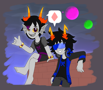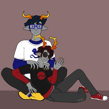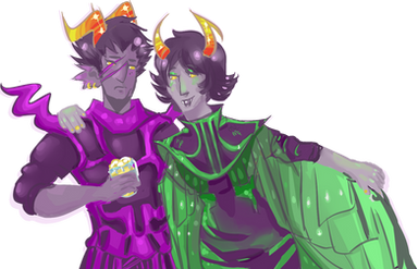 Fuschia!John and his multi-quadrant "pet" lowblood Dave. Pick a quadrant? Hell no, John wants all of them, and if anyone gets in the way they'll join the fun ghosts that like to hang around Dave all the time! Dave loves and hates and pities this demented little bastard, and deals with being decorated like a magpie however John sees fit. It's a small price to pay, really.tumblr link: themockingcrows.tumblr.com/pos…