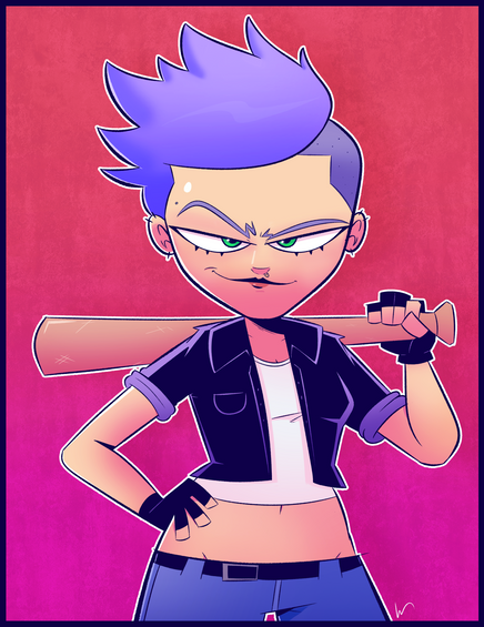 I love her sitting pose here and the combination of her purple outfit/hair and yellow-ish background.