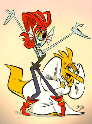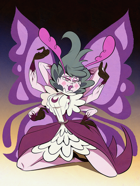 Also you put features of her like spiderwebs and smaller spiders in a more subtle way in, that is a good idea, so the focus remains on Muffet. And I love her face and colours