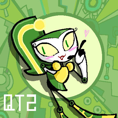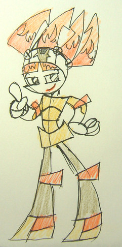 Even though it's not a very distinct part of the piece, I really like the background. For some reason, I feel that you chose it very well, 'cause it accentuates the robot-nature of the character. I guess it looks like a bunch of rivets, or a fan cover or something to me.