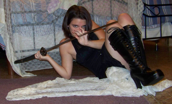 First part of the final series from this past photo shoot (and my favorite). Tube top+cargo pants+blue makeup=A very sleepy looking vampire! My hair hadn't seen the touch of a curling iron for over 5 years till we took this series. Many thanks to *Psycheen who acted as my photographer, hair dresser, and makeup artist for this series.More shots of the model in poignard and katana poses coming next! Single shots of this pack coming tomorrow.