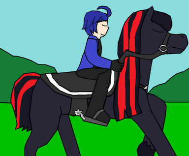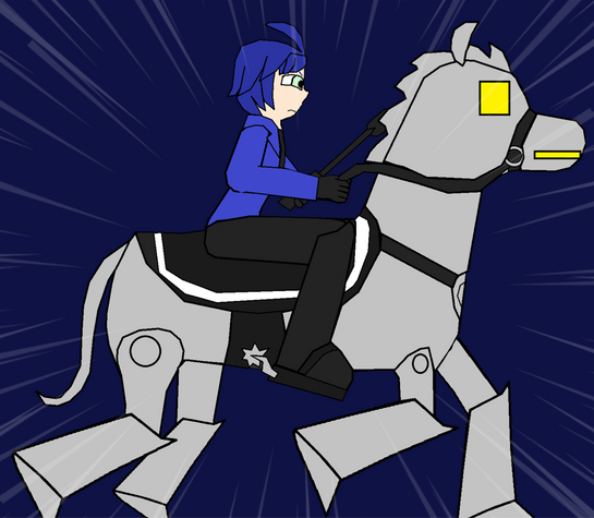How aboit this blue euden astride a robot horse with black english horse tack