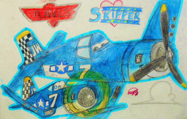 That's my first drawing of Skipper from the movie Planes. The legendary war plane in the Navy and I think Skipper,Bravo and Echo are my favourite army plane characters. It takes practice to draw planes and my sister say it looks pretty good for a Tim Burton Fan to draw, it takes time to colour him but I finally finished the drawing.