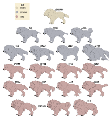 COAT TYPESFelvargs can have 12 different coat types, each one of these coats are sorted by rarity and some of them will be harder to obtain than others. The most common coat type is standard, followed by arctic, short, silk, savage, wisp, rugged and curly. Breeding two of the same coat type together is the best chance at obtaining said coat type, however coats other than standard are not always easily obtainable. Pairing standard with standard also has a small chance at creating the other coat types, while this is extremely rare, it is very possible. Cross pairing any coat types will increase the chance at those coat types.