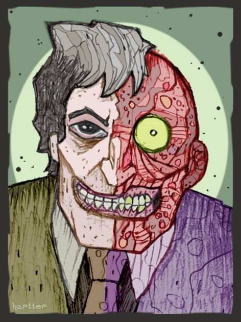 -after his accident, he become cold, unfeeling, and depressed. The only thing inciting his madness and any kind of passion being his new-found neutrality. After suffering due to the corruption of Gotham city, he believes anyone, good or bad, should be given equal accountability and judgment for their sins based on chance...the flip of a coin