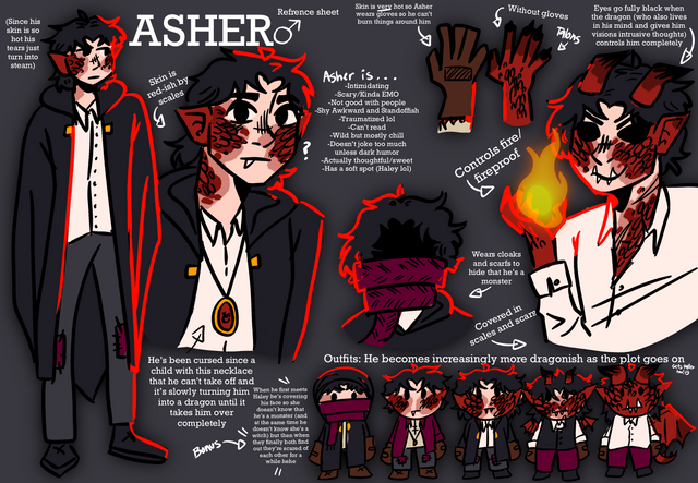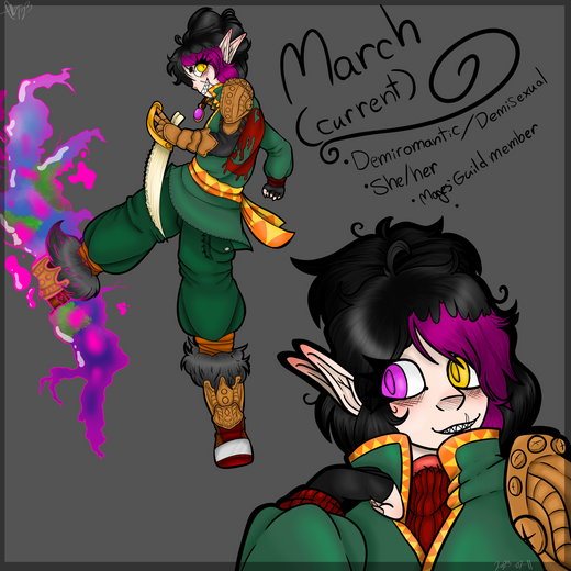 I finally got it all done! I hope y'all enjoy it ^^ Below is the full write-up of the characterUpdated Reference: CroweGeneral Character information:Real Name: Nilith YvesiNickname: CroweAge (in human years): 98 years of ageAge (In elvish years): 14 years of ageSex/Gender: Transfem (She/They)Sexuality: AroAce (relationships are gross)Height: 5'2"Weight: 49 KGRace: Blessed Dark ElfMagic Type: PyromancyMother: Taryn KnumariFather: Simril Yvesi Siblings: Ellis Yvesi (an older brother), Appearance Description (Art reference included):Eye colour: Deep blood-red with fiery highlightsEars: Angled, sharp. 3 sets (common for a dark elf)Hair: Long, thin white hair with red ends (dyed)Distinct Marks: Across her body are distinct red striped, which are a sign of not only being blessed by the gods that remain in the world, but also show that she's a pyromancer.Preferred outfits: She prefers robes with thick furred interiors, and often covers every inch of her body with layers of clothing, and a mask over the face, which in dark elf tradition is required when leaving their homes for their first pilgrimage. ,,, Biography: Nilith Yvesi grew up deep underground, born between her blessed father Simril Yvesi and her mother Taryn Yvesi. Nilith was born with the distinct markings across her body, demonstrating that she was like her father, inheriting the fire that roared through his bloodline. This meant that, despite her father disliking the traditions of his people, Nilith would have to leave home at a young age for a 40-year pilgrimage to learn of more magic and to find her own way as soon as she can capably wield the fire. Sadly for her father, Nilith was a born prodigy, demonstrating she was able to easily learn pyromancy, though it did hurt her small body. The council in charge of her hometown waited until Nilith was 91 years of age before they decided she was old enough. Simril, her father, argued fiercely against it but was shut down every time, and Nilith was both given the mask she now wears, and the nickname 'Crowe' to refer to herself as to not share her true face or name. Simril had already sent off his elder son and older sibling of Nilith out into the unknown years ago, and losing his second child proved to be too much for him, so he left his home and went after his daughter a month after she was sent out. His whereabouts have remained a mystery since. Crowe, as she is known by now, has been travelling for 7 years now, knowing that she's required to stay out of her home town for around another 33 years, has no intentions of going back after coming across some fellow dark elves from her home that let her know that Crowe's father had vanished shortly after she left, so she plans on finding him and living with her father away from her old culture. During her 7 years of travel, she came across Jaspar and his older brother Jesstricin, assisting them in fighting some Dire wolves that attacked the three. She agreed to travel with them after that, seeing the sword talent with Jaspar, and the healing capabilities of Jesstricin as highly useful. She's often treated like a little sister to the two, despite Jaspar being the youngest of the three, but doesn't argue much as she is much smaller than Jesstricin. They find March after they need to stop in a town by the capital, where she asked to join. They ask her generally what she has in terms of protecting herself, which gets March to admit she at this time has little to no survival skills, but does know basic medical skills and owns a powerful magic artefact called "Rift Breaker", which takes the form of a small, simple magenta charm on a leather string. They agree to let her come along, as long as she stays in safety by Jesstricin, and practices her magic as often as possible. Crowe is considered the well-researched prodigy of the group still, due to her intelligence with magic, but is still treated as an equal, which makes her happy to call the others her friends., Extra details/Information on Crowe:> Crowe's favourite food is BuckSpider Roast. BuckSpiders are large arachnids from the UnderLands, where all of the Dark elves reside. They're about as large as a grown man on average, and are described to have a nutty taste. It is often served with potatoes and simple vegetables.> Crowe's favourite dessert is Cinnamon Rolls/ Sweet rolls. They're something her father baked her all the time, so eating them reminds her of him.> Crowe resembles her father the most, sharing the same hair and eyes, with the blessed magic of him, but has her mother's skin tone and facial shape.