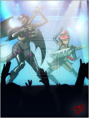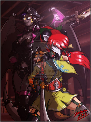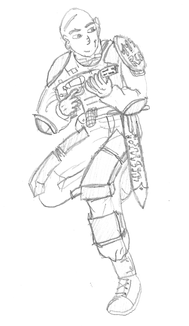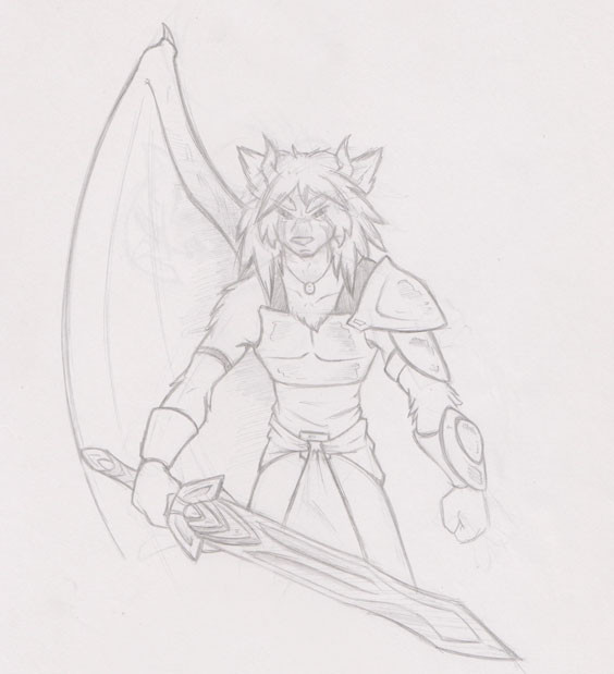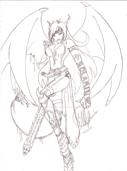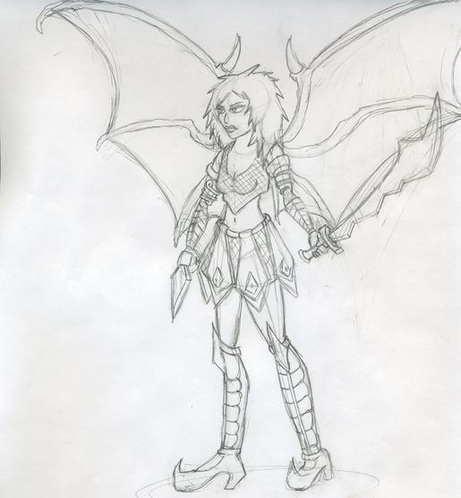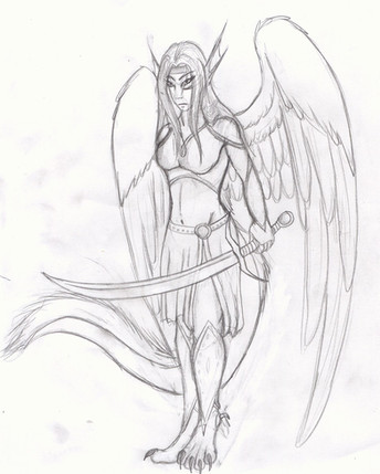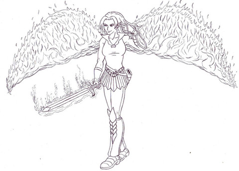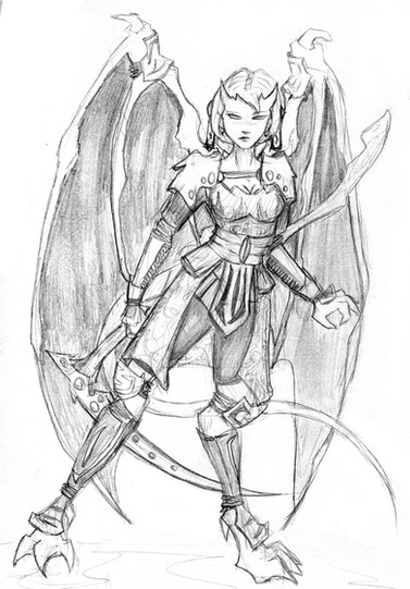 Encore un des personnages de Goria. Cette fois il s'agit de la fille de Naviento (un autre grand gaillard dont je n'ai réalisé aucun dessin) possédant une queue de lézard couverte de piquants, des cornes et une paire d'ailes en flammes. C'était ma première tentative.Another Goria's character . This time, it's Naviento's daughter (another big chief I've never tryed to draw) with lizard spiked tail, horns and enflamed wings. It was my first try.