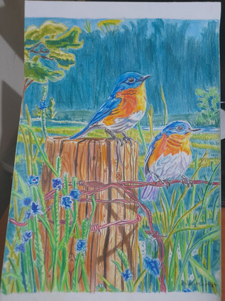 3/25 - Eastern Blue Bird with Albino Eastern Blue BirdYou can find Eastern Bluebirds in open country with patchy vegetation and large trees or nest boxes. Meadows, old fields, and golf courses are good places. Bluebirds typically sit in the open on power lines or along fences, with an alert, vertical posture. When they drop to the ground after an insect, they make a show of it, with fluttering wings and a fairly slow approach, followed by a quick return to the perch.