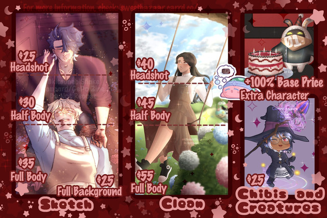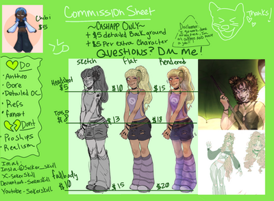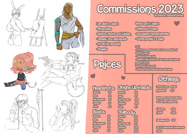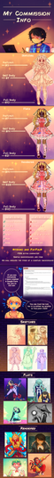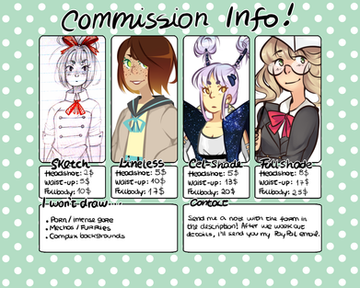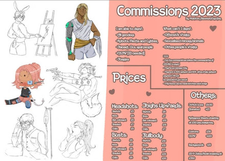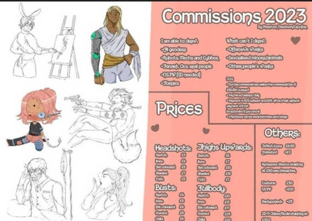 A friendly reminder to let you know that I have commissions open! please check them out. if you see something your interested in [but it isn't on the list] send me a message so we can work something out!tysm for all the likes, comments and other things, I appreciate you guys alot!