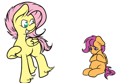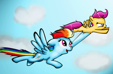 Rainbow Dash teaches Scootaloo to fly.Her wings may be small, but her initiative is limitless.
