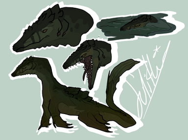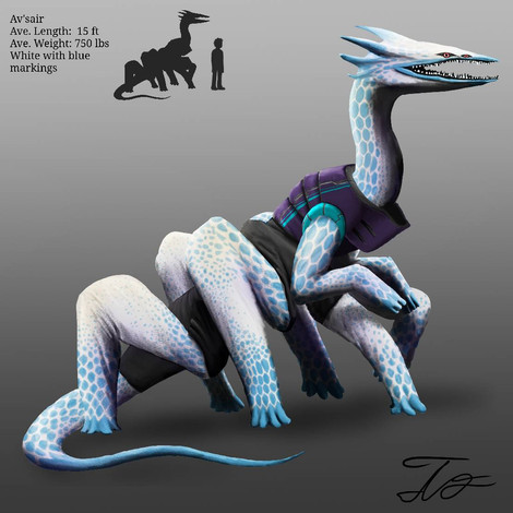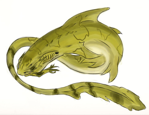 The Franch are a large mammal-like species from the tidal locked planet Frodia. They have long, sinuous bodies and swim relatively slow most of the time in shallow areas. The end of their tail has a claw like structure. This claw can adjusted to create different tail fins to allow bursts of speed, sea floor swimming or lazy drifting. Said claw can also be used in defense. The species has an eye-spot like marking on its tail and will swim backwards to confuse predators.While they breathe air, they have the ability to breathe oxygen from the water temporarily using modified offshoots of their nasal passages. These resemble flaps in front of their eyes. They have both teeth and fold-able rakers, allowing them to eat both large and small organisms alike.