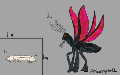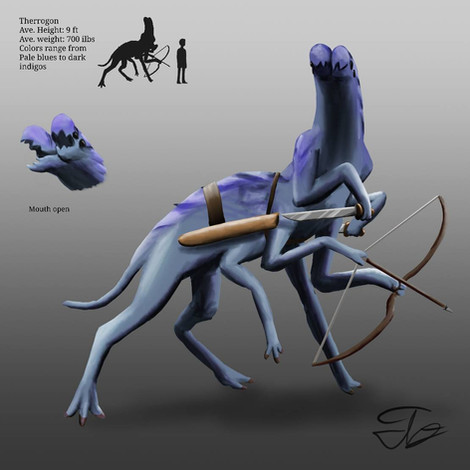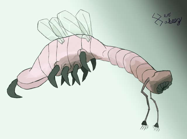 The Koboldites are a large cavern dwelling flying species. Their large wings are perfect for soaring through the wind sculpted caves of their homeworld. While the central mass of its body has a solid bone skeleton, the structure becomes more and more flexible the farther away from the central mass it is located. The tips of the wings, limbs and head all have flexible cartilage like skeletons. The heads “two” mouths are the fusion of its tongue into an additional jaw, an adaption member of the species find attractive. While their head does contain a small brain dedicated to eyesight, their main brain is in their midsection where their strongest bones are.Their sense of smell is extremely lacking as they do not have specialized structures for the detection of smells, instead using the lining of their mouths. Along their underside they have 3 pairs of retractable tentacles for manipulation of objects. These limbs are not strong enough to lift large objects, so the middle pair of limbs is used while the wing pairs become used for locomotion. Their lidless eyes are adapted for much darker spaces, so they tend to wear shades or related eye coverings when traveling off world. Their method of communication involves deep ultra-low vibrations when communicating over long distances, to loud whooping sounds over short distances