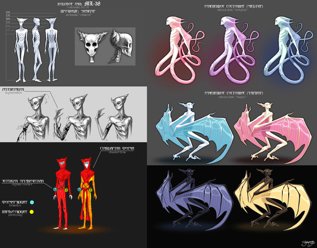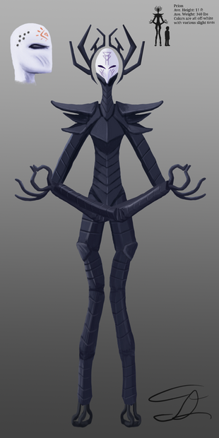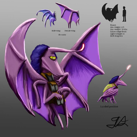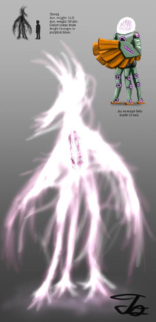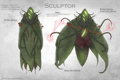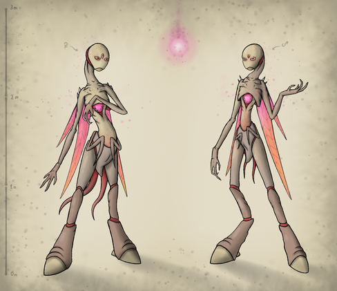 The Moruth are an insectoid race from Chaerioth V. They have 3 body segments, the head, the body and join stalk. Their "head" contains eyes and main thinking brain but no mouth. Their actual mouth is on the center of their body segment. The joiner stalk contains a large, thickened nerve cluster which acts as a junction station for the main brain signals. Their flexible fingers act as antenna for both tasting and smelling. Their bodiesβ outer covering is actually their hardened vestigial wings, which they use along with their syrinx like organs to mimic a large number of sounds, similar to a mockingbird.Unlike most species which are duel or single sexed, the Moruth have a slightly different system. The most common form, the Alpha Moruth, comes in two varieties. C-type and S-type. To reproduce, a C-type and an S-type will come together and grip each other tightly. The S-type will then produce a silky cocoon covering like a silkworm, covering the two, a process that takes several hours. Both types can asexually create nonviable eggs, which can be eaten by many species but are generally used to feed their own young.