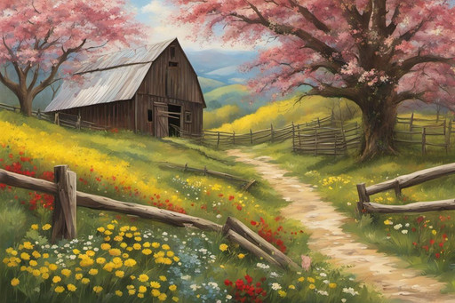Prompt: A Beautiful Spring Day with a Scene of Blooming Trees, Wild Flowers and a Wooden Fence (enhanced)