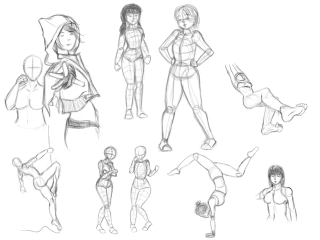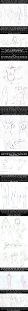 2) First of all, I'd like to introduce you to my "stick man method" where, as you can see, I've drawn the pose using lines as the major part of the legs, arms, and torso and circles as the joints and the head, as well as the feet, hands and (since it is a woman) the breasts.