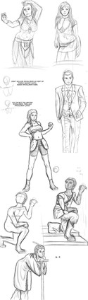 4) Now the fun starts. Draw the stick man in the pose you want, adding a little extra oval on the limb closest to you. This reminds you which arm is in what position. Then continue to draw a rough draft of your person. You should wait until later to add details. Remember! You still have to erase the stick man lines once you finish the contour lines (outlines). I've drawn to examples here, one with the dominant (closer) leg in the back and one with it in the front, as with the arms. The examples also show you how I draw a face in profile view (roughly).