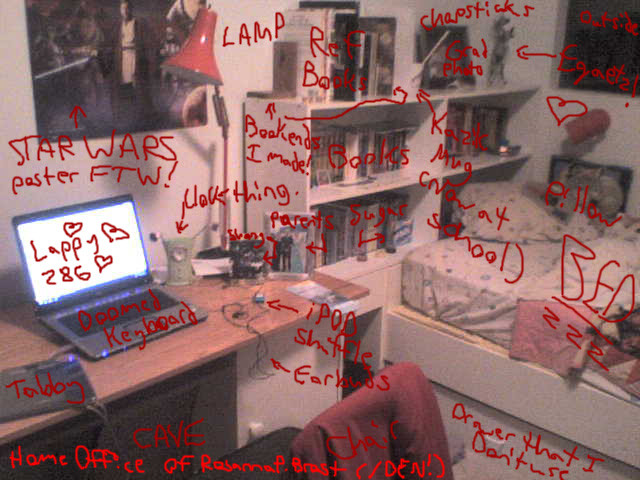I'm off to my last year of college in two weeks and then hopefully I'll be moving out of my parents' house, so I guess it's fitting to post this before it doesn't exist anymore.^FionaCreates asked for workspace photos annotated so I contributed. Not much of a space (not like I get much done) but you get the idea.