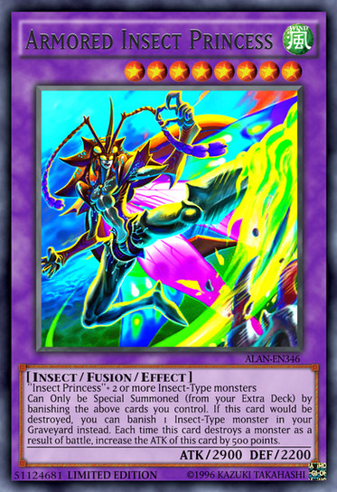 Must first be Fusion Summoned with the above monsters. If this card would be destroyed by battle or card effect; you can banish 1 Insect-Type or Insect-Warrior-Type monster in your Graveyard instead. Each time it destroys a monster by battle: It gains 500 ATK.