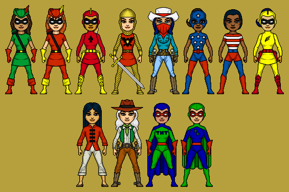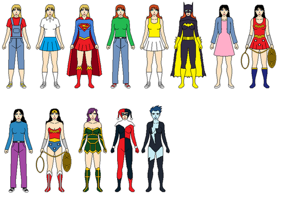 First row is the Golden Age, the origins. The first trio are they designs from Action Comics #1, Detective Comics #27 and Sensation Comics #1. The second trio is their more recognizable designs from most of the Golden Age, although trading Superwoman's comics design from the one from the Fleischer Cartoons. And closing the row, it's the live-action designs from Christopher Reeve, Adam West and Lynda Carter.