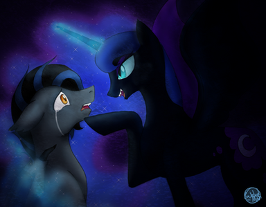 Days has past since then, Luna just stares into her fear, until Celestia finally finds her way to her. Taking Luna away from the wall, reassuring her that he's just trying to hurt her.