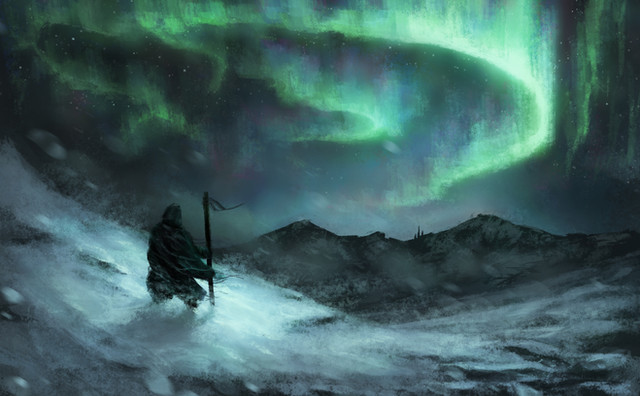A Commission for a landscape that includes a heating aurora like event, that melts the ice on the mountains and leaves the surrounding area still frozen.Thank you for looking!