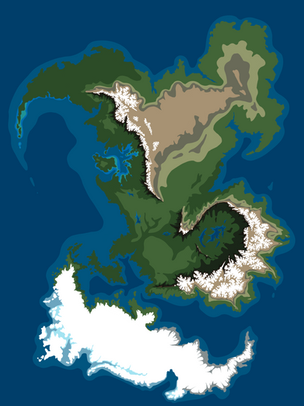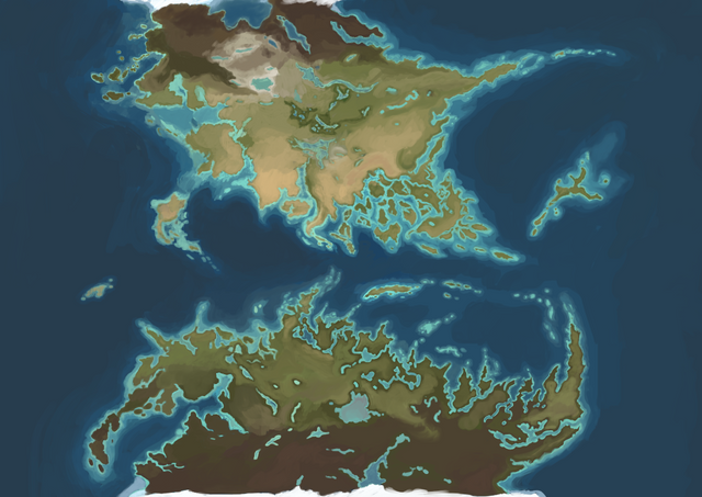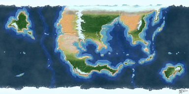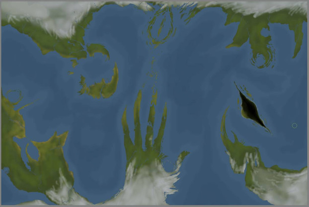Started with a shallow ocean and drew in the continents and land masses. Roughed out some strong mountain shapes, exported the height map files, eroded it using wilber, and used PS for the paint scheme.