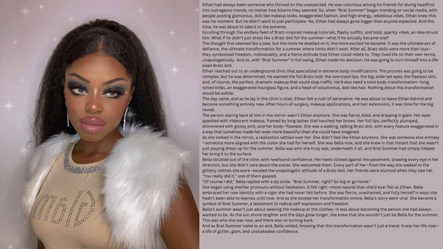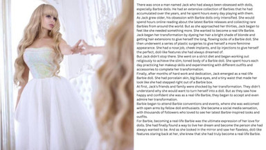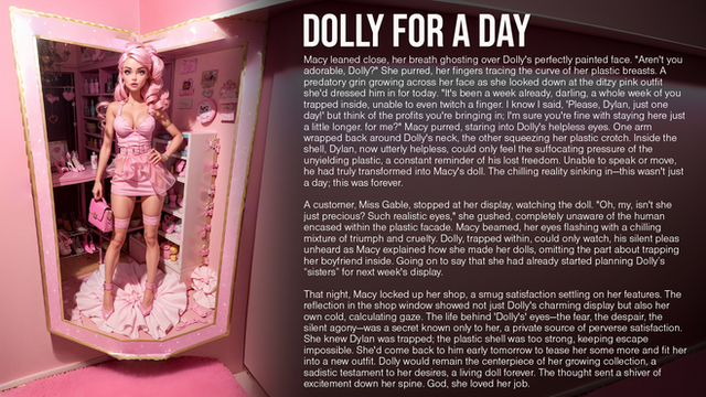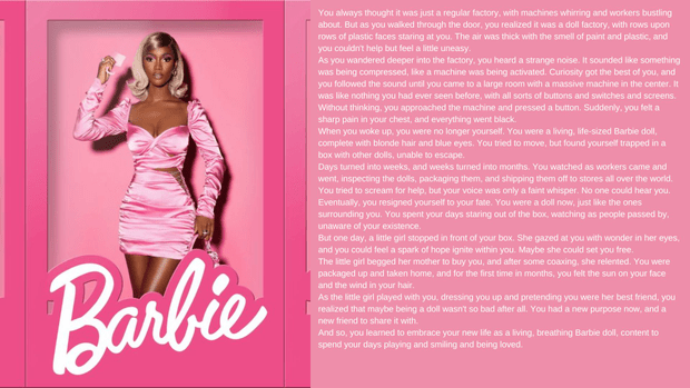 When you woke up, you were no longer yourself. You were a living, life-sized Barbie doll, complete with blonde hair and blue eyes. You tried to move, but found yourself trapped in a box with other dolls, unable to escape.