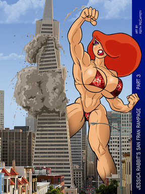 The first in a series of new Jessica Rabbit commissions I've got in the works. Once again, she's musclebound, in a bikini and on a rampage, but THIS time she's GIGANTIC! There'll be a bus in her hands.Related content