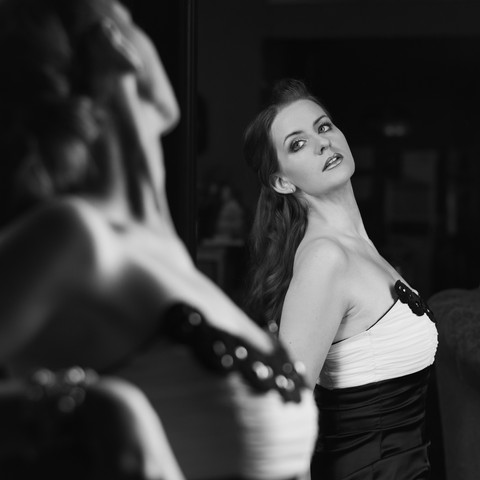 When he entered the room, she was standing in front of the mirror, pinning up the last strands of her hair. Standing in a long dress highlighting her beautiful shapes. Only in the dress. He came from behind, placing his large paw on her lower belly, kissing her neck warmly. A pleasant shiver ran down her neck, so she closed her eyes and leaned her back safely on him. He watched in the mirror as she was dancing gracefully under his touch. At one point she turned to him and kissed him passionately on the lips, touching his bare chest with admiration. Finally she whispered:(...)
