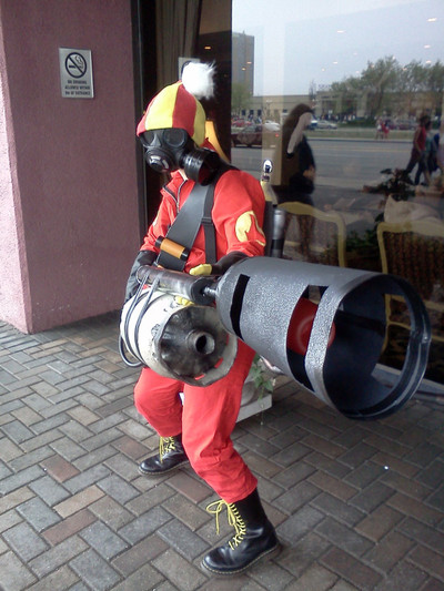Simply amazing! I'm working towards my own Pyro and I wanna use a GP-6, but how the hell do I cover the hear holes without making it look stupid... Anyway, great job for being done in a pinch. Heh. Me and my little sister just threw together a make-shift Scout, actually. Last minute costumes for the win!