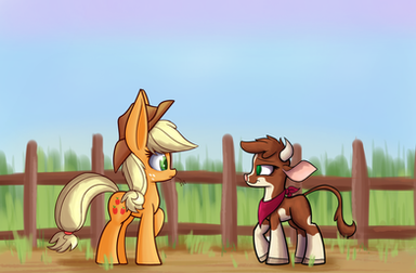 "Yeehaw! Get along little dogie, yer mother's waitin' on ya!"Applejack "escorts" an overly adventurous young calf back to it's herd. Y'know, I've been thinking, remember Applebuck Season? So, these cows can talk, right? Do the ponies pay them for their services or is this a slavery type dealio? Not only that, but big splotchy Holstein dairy cows like the ones in the show aren't naturally occurring, they were selectively bred into existence. Did the Equestrians just, uh, instruct them who they should and shouldn't breed with over the course of thousands of years? And the cattle were totally okay with this arrangement... riiight. Something is rotten in the state of Denmark. Wait, the Holsteiner isn't a working cow, what's a horse need milk for? Either Ponyville has an overwhelming population of orphaned foals whose thirst needs slaking, or these ponies have highly unusual digestive tracts. And Applejack owns pigs and chickens, too. I can only think of two uses for a pig: meat or truffle-hunting, and if the Apples have ever sold mushrooms it's slipped from my memory.