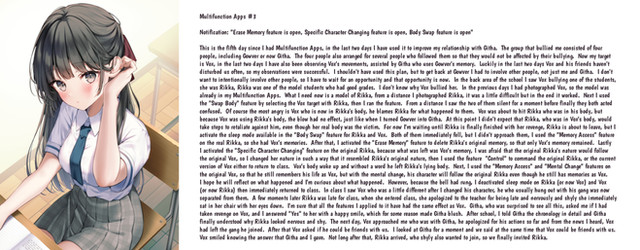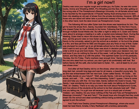He spun around to find the source of the sound but saw nothing. However, he felt a sensation like the swing of long, black hair—the hair he never had. Nervously, he looked into the room's mirror and saw 'her' reflected there, mirroring every movement he made. The reflection showed a girl with long black hair, black eyes, wearing a black sailor uniform with a red bow, and a short skirt. She was petite, making the room seem larger than before. This was his reflection, familiar yet unsettlingly different. Memories flashed through his mind—memories of the girl that were somehow also his own.