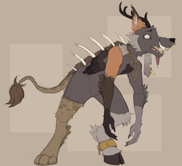 his fur and feathers are scraggly and coarse, and his skin is rough and dry. he heals exeptionally quickly, but does have a few scars (many from gunshot wounds.)